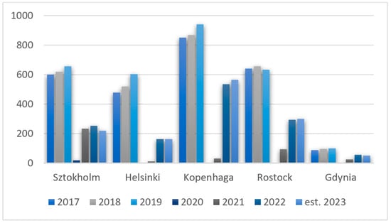 Cruise ship passengers in selected Baltic Ports in 2017–2022 with estimation for 2023 (in thousands of passengers). Source: Own study based on Cruise Baltic and Cruise Europe websites [,].