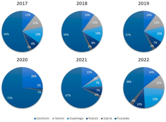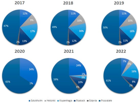 Percentage share of selected Baltic Ports in 2017–2022 in the Baltic Sea arena in terms of the number of cruise ships calling at ports. Source: Own study based on Cruise Baltic and Cruise Europe websites [,].