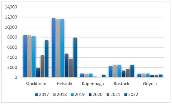 Ferry exchange passengers in selected Baltic Ports in 2017–2022 (in thousands of passengers). Source: Own study based on the statistical office of the European Union—Eurostat [].