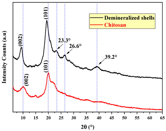 The characteristic peaks of chitosan centered at 10° and 20° in 2θ, which are presented in Figure 1, corresponded to the crystallographic planes of (002) and (101), respectively. Similar results have been reported by Molatlhegi et al. [44] and Antonino [33].