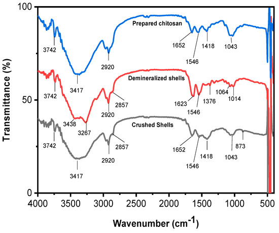 ATR spectra of crushed shells, demineralized shells, and prepared chitosan.