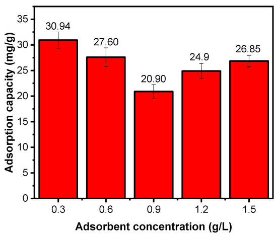Effect of adsorbent concentration on adsorption capacity (C0 = 50 mg/L, pH = 6.5, T = 25 °C, t = 240 min).