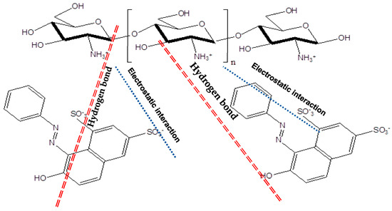 Figure 6 shows a rapid drop in the adsorption capacity with increasing pH, from 33 mg/g at an acid pH to 21.6 mg/g at a neutral pH, and this decrease continued until an alkaline pH. Since the pHpzc value of chitosan was 8, (Figure S2), at pH < pHpzc, the surface of the adsorbent was predominantly positive, and since OG is an anionic dye, the maximum adsorbed amount was noted at a very acidic pH. Similar results have been reported in several studies [50,51]. Under acidic conditions, the amine groups (–NH2) of chitosan could be protonated by H+ in the solution; in addition, Orange G was dissolved in the aqueous solution, and its sulfonate groups were dissociated, as illustrated in Figure 5.
