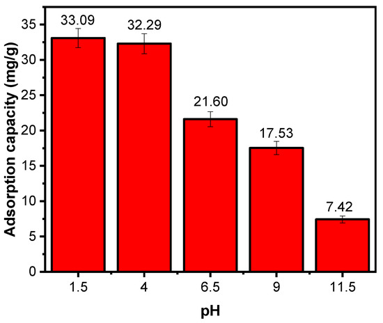 Effect of solution pH on the adsorption capacity (adsorbate concentration = 50 mg/L, S/L = 0.9 g/L, T = 25 °C, t = 240 min).