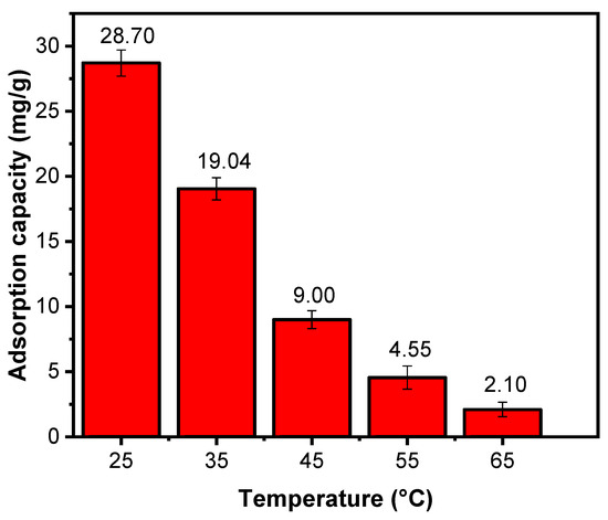 The thermodynamic study of any adsorption process provides information on the energy changes and shows whether the process is spontaneous or not [67]. It is essential for predicting the adsorption mechanisms. In our study, the thermodynamics of the adsorption process were examined at five different temperatures from 298.18 K to 338.15 K. Thermodynamic factors, such as Gibbs free energy change (∆G0), the change in enthalpy (ΔH0), and the change in entropy (ΔS0), were evaluated using the Van’t Hoff equation [68]: