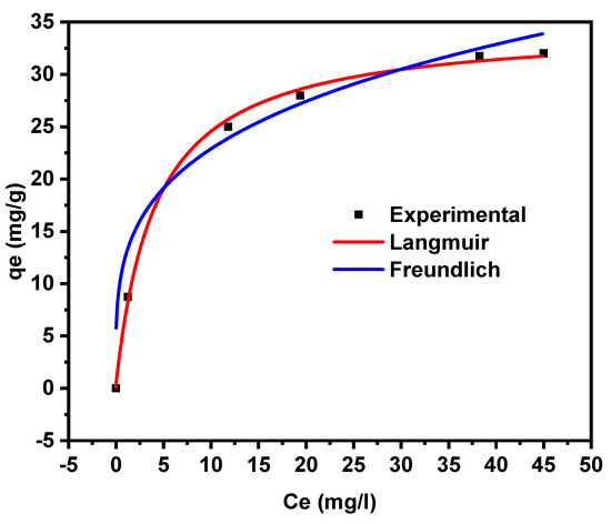 It is clearly represented in Figure 4 that the adsorption capacity of Orange G dye slowly decreased with the mass of the adsorbent in the mass range between 0.3 and 0.9 g/L, (from 31 mg/g to 21 mg/g). After that, it increased proportionally with this dose up to 27 mg/g at 1.5 g/L. As the concentration of adsorbent increased, the adsorption capacity efficiency of the pollutants increased, but there was no direct proportionality between the amount of adsorbent and the amount of pollutant removed. This can be attributed to the fact that the shape of the sorption isotherm changed with increasing biosorbent concentration [49].