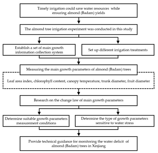 Therefore, this study aimed to examine the changes in the major growth parameters of almond trees in relation to water supply conditions through field experiments based on the constructed measurement system in Xinjiang. The specific research objectives of this study were as follows: (1) to use various sensors to construct a monitoring system that can continuously and non-destructively measure the growth environment and physiological data of almond trees; (2) to perform an irrigation experiment covering all the growth stages of almond trees under different irrigation levels, and summarize the changing patterns of various physiological parameters related to almond trees under different SWCs; and (3) to select physiological parameters and measuring time during the day in Xinjiang that can be useful for monitoring the water deficit status of almond (Badam) trees based on the changing patterns of various physiological parameters. The research roadmap is shown in Figure 1.