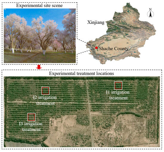 The experiments were carried out in the state-owned No. 2 Forest Farm in Shache County (Kashgar, Xinjiang, China; latitude: 38°12′1″ N, longitude: 77°8′20″ E). This experimental site is located in Aslanbagh Town in the south of Shache County, which is in the northern foothills of the Kunlun Mountains and in the middle and upper reaches of the Yarkant River. The site has a temperate continental climate, which is characterized by four distinct seasons, dry weather, long sunshine hours, large evaporation, more sunny days, and a large temperature difference between day and night. It has an elevation of 1231.2 m and an average annual temperature of 11.4 °C. The precipitation varies greatly, and the annual average precipitation ranges from 46.1 to 50.0 mm. Although the precipitation is low, it is concentrated in specific months, mostly from April to September. Northwesterly winds prevail throughout the year, with annual average and maximum wind speeds of 1.9 m/s and 28 m/s, respectively. The average frost-free period is 214 days. The average number of sunshine hours throughout the year is 2806 h, and the total annual solar radiation is 145.8 kcal/cm2 [7]. The soil type at the experimental site is sandy loam, with the bulk density of 1.45 g/cm3, the permanent wilting point is 5.8% (v/v), and the field capacity of the soil is 35.19% (v/v) within 100 cm, an organic matter content of 10.69 g/kg, quick-release contents of nitrogen 51.55 mg/kg, phosphorus 7.59 mg/kg, and potassium 143.90 mg/kg, and a pH of 8.2 [32]. Surface water was used for irrigation, mainly from the Yarkant River which was approximately 150 m from the experimental site.