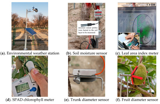 The system for collecting data pertaining to the growth parameters of almond trees during the experiments consisted of a weather station, soil moisture sensor, canopy temperature sensor, plant canopy analyzer, chlorophyll meter, trunk diameter sensor, and fruit diameter sensor. To guarantee the accuracy of the measurement results, all sensors were checked for accuracy before use. This system can collect environmental information such as air temperature, photosynthetically active radiation (PAR), and soil water, as well as plant information such as LAI, chlorophyll content, trunk diameter, and fruit volume, in a real-time manner during the observation period (Figure 3). The time periods for collecting experimental data were the same as those for the growth stages listed in Table 1.