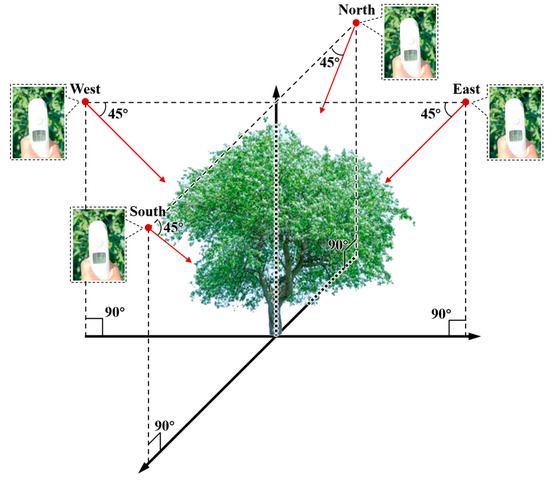 The canopy temperature was measured using an infrared thermometer (SYS-3205, Liaoning Saiyasi Technology Co., Ltd., Panjin, China), which was employed in this study to measure non-metallic targets using 0.95 emissivity within the 5–14 μm wavelength range (infrared). The canopy locations for temperature measurement using the infrared thermometer are shown in Figure 4. At approximately 14:00 every day, three values were measured at approximately 0.5 m above the canopy at each of the four directions (east, south, west, and north) at a 45° angle of elevation back and forth. Their average value was taken as the canopy temperature of the almond trees. In addition, measurements were taken every 2 h from 08:00 to 18:00 in typical weather (sunny and cloudy days) to measure the daily variations in canopy temperature. The canopy/air temperature difference (ΔT) was obtained by calculating the difference between the canopy temperature (Tc) and the air temperature (Ta) during each measurement.