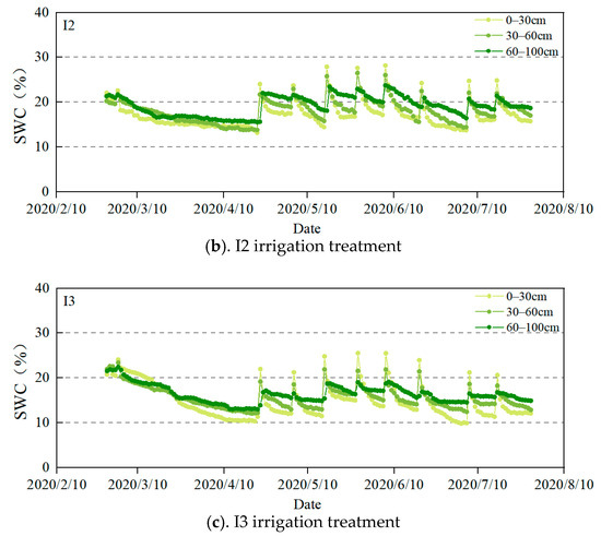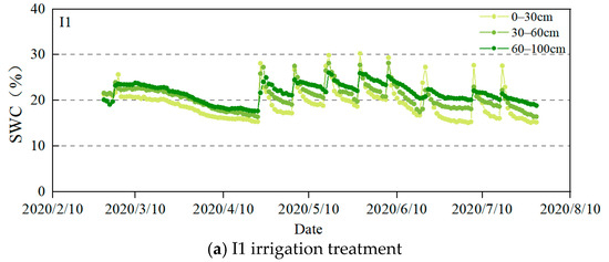 Variations of the soil water content (SWC) in soil layers at different depths under I1, I2, and I3 irrigation treatments.