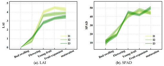 The variations in LAI and SPAD values of almond trees during the growth stages are shown in Figure 6. It can be seen that both parameters exhibit an overall gradually increasing trend. As shown in Figure 6a, the LAI value was zero when the leaves in the canopy were in the sprouting state at the bud swelling stage of almond trees. As the weather warmed up, the canopy grew and developed, and the leaves grew rapidly with LAI increasing from 0.7–1.1 at flowering stage to 2.8–4.0 at young fruit stage. After the young fruit stage, the nutritive growth phase of almond tree ended, and the reproductive growth phase began. The plant began to transport nutrients primarily to the fruit, leading to a gradual slowdown in canopy leaf growth. Therefore, LAI remained at a relatively stable level (3.3–4.5) throughout fruit expansion and maturation. Under different irrigation treatments, the canopy LAI of almond trees gradually differed with plant growth. The LAI from the young fruit stage to the maturation stage was ranked in the order of I1 (4.0–4.5) > I2 (3.6–3.9) > I3 (2.8–3.5). This suggests that SWC had a significant effect on canopy leaf growth. Although the overall trend for SPAD (Figure 6b) was similar to that of LAI, there was no significant difference in the SPAD values under different SWC values, suggesting that the canopy chlorophyll content measured using the SPAD instrument did not effectively reflect the changes in the moisture content in the almond trees’ environment.
