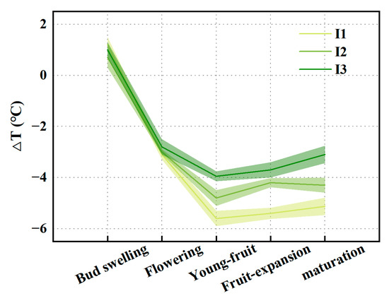 As shown in Figure 7, different irrigation treatments had significant effects on the ΔT of almond trees, where differences in ∆T between different soil water environments were lower at early growth stages (i.e., bud swelling and flowering stages) when the canopy leaves were young (LAI ≤ 1.1). As trees grew, almond trees with adequate water supply had greater leaf area values; (LAI was the highest under I1 treatment, followed by I2, and then I3 (I1 > I2 > I3). Additionally, transpiration was more intense in trees irrigated with higher amounts of water [8]. As a result, the ΔT between different irrigation treatments gradually widened from the young fruit stage to the maturation stage. Overall, ΔT was the lowest in I1 treatment, followed by I2 and I3. That is, I1 (−5.6 to −5.1 °C) < I2 (−4.8 to −4.3 °C) < I3 (−3.95 to −3.1 °C).