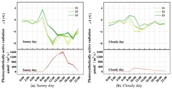 To understand the changing pattern of the ΔT of almond trees in-depth, canopy temperature was monitored throughout the day on a typical sunny day (1 July 2020, Figure 8a) and a typical cloudy day (28 June 2020, Figure 8b). The sample plants under I1 treatment on these two days were at the maturation stage and were characterized by more stable physiological activities [36,37]. Therefore, the daily variation in their canopy temperature is relatively representative. The changing trends of the ΔT and PAR of almond trees in the sunny environment presented in Figure 8a show an overall increasing trend first, then decreasing, and increasing again. Combined with the trend plot of photosynthetically active radiation values, data show that solar radiation was 0 during nighttime (0:00–6:00), the canopy temperature did not differ much from the air temperature, and ΔT was approximately 0 °C. As the sun rose, the light radiation received by the canopy was converted into heat, leading to a gradual increase in ΔT. At approximately 8:00, the canopy began transpiration, and water volatilized by absorbing part of the heat, resulting in a gradual decrease in canopy temperature. As solar radiation was too strong after 12:00, the leaf stomata of the canopy were partially closed [38], and transpiration was relatively reduced, causing an increase in ΔT. After 16:00, the intensity of solar radiation weakened, the leaf stomata reopened, and the effect of canopy transpiration increased, causing a slight decrease in ΔT. After 18:00, with sunset, the intensity of sunlight and transpiration decreased, resulting in a gradual increase in ΔT until it eventually returned to near 0 °C. The variation trend of ΔT on the cloudy day was approximately the same as that on the sunny day. However, the variations in ΔT values were lesser on the cloudy day (5.4 °C) than those on the sunny day (12.3 °C), which was due to the weaker intensity of solar radiation and the reduced transpiration on the cloudy day. The heat absorbed by the canopy on the cloudy day was reduced, ultimately resulting in a higher ΔT (−3.9 to 1.5 °C) than that on the sunny day (−8.8 to 3.5 °C). Regardless of whether the days were sunny or cloudy, the all-day ΔT under different irrigation treatments also showed a trend similar to that of ΔT on sunny days (Figure 8a); that is, I1 < I2 < I3. It can be seen that the effect of soil water content on the ΔT of almond trees was consistent throughout plant growth, but the significance of its effect on the ΔT still needs to be further analyzed in the following sections.