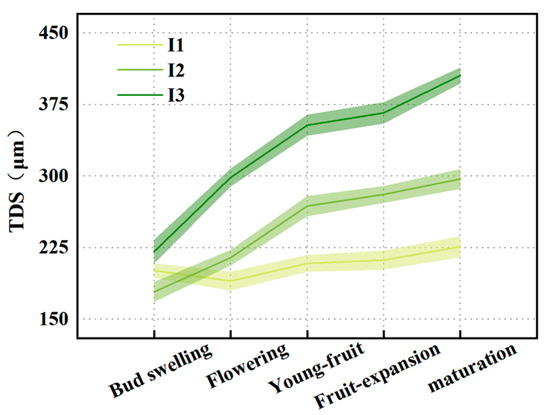 Variations in the trunk diameter shrinkage (TDS) of almond trees at each growth stage under irrigation treatments I1, I2, and I3.