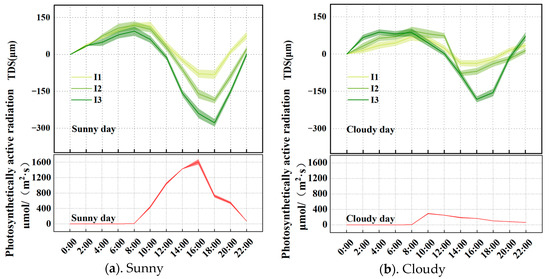 Variations in the trunk diameter shrinkage (TDS) of almond trees at the maturation stage under irrigation treatments I1, I2, and I3 on sunny and cloudy days.