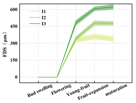 The variations in the FDS of almond trees are shown in Figure 11, which are similar to those in the TDS both during the whole growth period and on a single-day scale. That is, the FDS gradually increased from the young fruit stage to the maturation stage and was ranked in the order of I1 < I2 < I3 under different irrigation treatments. On a single-day scale, almond fruit also exhibited an initial swelling process, followed by shrinking and swelling; the FDS under different irrigation treatments was also ranked in a sequence of I1 < I2 < I3.