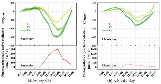 Variations in the fruit diameter shrinkage (FDS) of almond trees at the maturation stage on sunny and cloudy days under irrigation treatments I1, I2, and I3.
