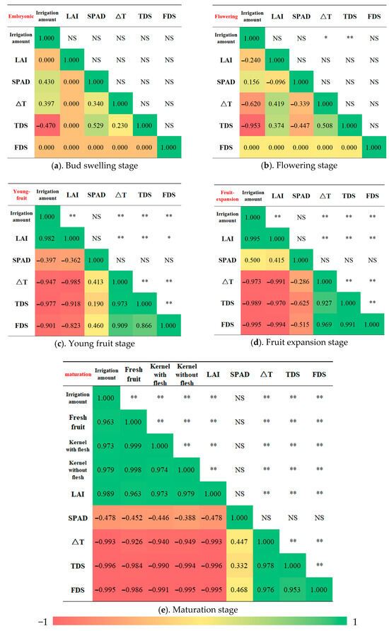 To better analyze the response of almond trees to different irrigation treatments, the changes in major physiological parameters were summarized in relation to irrigation treatments. As shown in Figure 13, all physiological parameters except SPAD were significantly correlated with irrigation treatments. Among them, fruit yield and canopy LAI decreased as the amount of water for irrigation reduced; ΔT, TDS, and FDS increased with the increasing irrigation amount. The correlations (correlation coefficient r) between the main physiological parameters and the irrigation amount at each growth stage are also shown in Figure 13. During the early growth stages (bud swelling and flowering), only the TDS was negatively correlated with the irrigation amount (r = −0.470 to −0.953). This was because the water treatment experiment had just started, and the physiological activity of almond trees was weak in the spring. With the onset of summer, solar radiation gradually increased, leaves and fruits continued to grow, and all physiological activities of the plants became more active. In addition, correlations among the parameters peaked at the maturation stage. Specifically, ΔT, TDS, and FDS showed significantly negative correlations with irrigation treatment and fruit yield (r = −0.949 to −0.996). Significant positive correlations (r = 0.953–0.978) were observed between ΔT, TDS, and FDS. The correlation coefficients indicate that when the irrigation amount was reduced, canopy LAI, fruit yield, and trunk/fruit volume decreased, and canopy temperature increased accordingly. However, the SPAD value did not change significantly.