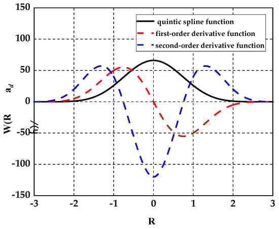 The smooth kernel function adopts the quintic spline function, and in order to verify its smoothness, the first- and second-order derivative function images of this function are plotted, as shown in Figure 1.