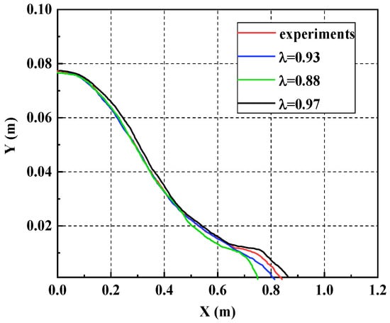 The classical dam failure problem is utilized to verify the sensitivity of the particle velocity correction formula. The SPH program is written in the Fortran language to establish the classical dam failure model with a length of 0.3 m and a height of 0.1 m. The relevant parameters in the program are consistent with those presented in []. The choice of the smoothing coefficient in the velocity correction directly affects the stability of the calculation. Setting = 0.97, 0.93, and 0.88 when the dam failure is carried out for 0.36 s, the numerical simulation results are compared and analyzed for similarity with the experimental results from [,] by using the method of relative error, and it is found that the free-surface height curve is closer to the experimental value when = 0.93. As shown in Table 1 and Figure 2.