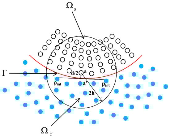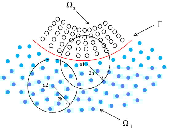 Two different SPH particles are used for fluids and solids, and when the particles are more than 2 h away from the fluid–solid interface, all of the particles interact only with the same kind of particles, but when the particles close to the interface are interpolated for SPH, both fluid and solid particles are involved. For viscous fluids, the XSPH [] method and the introduction of no-slip boundary conditions can be used to define the coupled interface, but for the viscous fluids used in this paper, this method is not applicable; so, dynamic interface conditions and kinematic interface conditions must be introduced to deal with the coupled flow–solid interface. As shown in Figure 3.