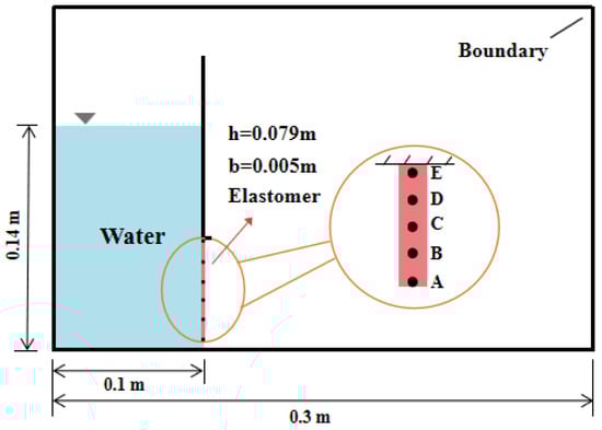 In order to verify the effectiveness of the program based on the physical model experiment’s related parameters outlined in [], an elastic gate numerical model that combines the SPH method and finite element method is established. At the moment when the elastic gate constraints are lifted (time: 0 s), the dam-breaking water flow generated by the water pressure will cause the elastic gate’s continuous movement and deformation. In this paper, the numerical model of the fluid–solid interaction based on the SPH method and the finite element method and the experimental results from [] will be compared and analyzed in terms of the flow regime of the water body, the gate opening, and the change in the free liquid level and the fluid–solid force. The initial arrangement of the model is shown in Figure 5, where a rectangular body of water with a length of 0.1 m and a height of 0.14 m is arranged in a rectangular tank measuring 0.3 m × 0.2 m. Rigid baffles and flexible gates control the flow of water, with gates measuring 0.079 m high and 0.005 m wide. In order to verify the force on the fluid–solid interface, five characteristic points of A, B, C, D, and E were selected along the gate with an equal spacing of 0.0158 m between them. The physical time selection is consistent with the experimental physical time presented in the literature, where the numerical simulation time is 0.4 s. The other calculation parameters related to the SPH model and finite element model are shown in Table 2.