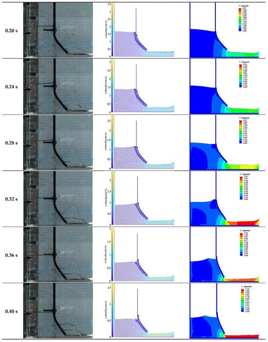 Based on the SPH method and FEM method, the elastic sluice gate opening was compared with the experimental data from [], as shown in Figure 6. Before the sluice discharge water flow and elastic gate are in a static state, the sluice produces a discharge under the action of gravity. As the elastic gate is under the impact of a water flow that is constantly in motion, the gate is gradually opened, and a large deformation is produced. Analyzed from a qualitative and quantitative point of view, the degree of deformation of the gate at each moment during the numerical calculation of the SPH method and the finite element method is consistent with the trend of the opening of the gate in the experiment. The water flow is at a standstill at 0 s, when the velocity of the water flow is also zero; at 0.04 s, the elastic gate gradually opens, the maximum velocity of the water flow according to the SPH model is around 1.03 m/s, and the maximum flow velocity of the water flow according to the FEM model is around 1.09 m/s. At 0.08–0.12 s, the gate gradually opens, and the front end of the water flow reaches the maximum velocity and produces a certain amount of water jump; the maximum velocity of the water jump produced by the SPH method and the FEM method is 1.77 m/s and 1.83 m/s, respectively. At about 0.16 s, the gate opening reaches its maximum value, and the water velocity increases to 1.86 m/s and 1.92 m/s. In general, the water velocity under the FSI model based on the FEM method is slightly larger than that of the SPH model at all moments of the flow. After 0.2 s of the sluice gate discharging continuously, the water pressure behind the gate and the gate opening gradually decreased. At this time, the water flow velocity of the two numerical models reached the maximum value, and it was 3.56 m/s and 3.96 m/s. During the whole process from 0.24 s to 0.40 s, the gate opening and the water flow velocity were gradually reduced, in which the decay rate of the FEM model was larger than that of the SPH model. The water flow velocity of the SPH model decreased from 3.17 m/s to 1.63 m/s, with a decrease ratio of 51.4%, while the water flow velocity of the FEM model decreased from 3.31 m/s to 1.15 m/s, with a decrease ratio of 65.3%; the results from the two numerical methods coincided with the experimental results from the literature during the simulation process, which in turn indicates the effectiveness of the procedure. But the numerical model of fluid–solid coupling based on the finite element method (FEM) showed a more pronounced rate of change in the resilient gate recovery after 0.2 s, which is a deviation from the experimental results in the literature. This, in turn, indicates that the results of the numerical simulation based on the SPH method are closer to the experimental results.