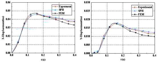 For the presentation of the simulation results of elastic sluice discharge, one of the important evaluation methods is comparing the displacement change curves of the gates under the action of water flow. In order to further investigate the difference between the SPH numerical simulation and finite element numerical simulation results and the experimental results, analyzing them from a quantitative point of view, the gate displacement change curves of these three methods are made by selecting the moment from 0 to 0.4 s, as shown in Figure 7.