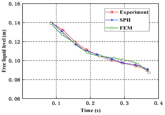 In order to further verify the validity and accuracy of the fluid–solid procedure, the two methods were compared with the experimental results from [] with respect to the free surface profiles. Using the similarity formula, The calculation results are shown in Table 3. It was found that the SPH numerical simulation results are highly similar to the experimental results, with a 91.4% similarity, while the finite element calculation results are 85.7% similar to the experimental results; the three free liquid level curves are shown in Figure 8.
