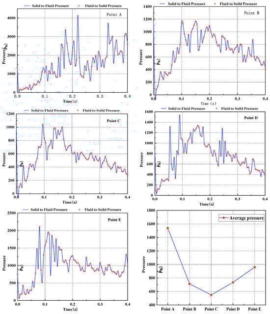 By selecting different measurement points on the elastic gate, we investigated whether the pressure of the solid on the fluid and the pressure of the fluid on the solid are equal, and analyzed the change rule of pressure, as shown in Figure 9. At different moments within 0–0.4 s, the pressure of the solid on the fluid is equal to the pressure of the fluid on the solid, which satisfies the action–reaction principle and verifies the nature of the dynamic boundary. The pressures at the initial moments of the measurement points A–D are 1336.72 Pa, 1191.92 Pa, 1044.77 Pa, 897.62 Pa, and 750.47 Pa. The pressure under the action of the fixed fluid increases with the increase in the depth of the water in the case of the same force area. Throughout the simulation process, the force at each measurement point shows a trend of first increasing and then decreasing. In the measurement points A–D, the maximum force is produced in decreasing order of 0.22 s, 0.15 s, 0.095 s, 0.09 s, and 0.08 s, and the elastic plate shows that the two ends of the force are large while the middle of the force is small. The elastic plate free end of measurement point A is the largest force, the middle of measurement point C is the smallest force, the fixed end of the force at measurement point E increases again, and the average pressure decreases from 1537.57 Pa to 549.02 Pa and then increases again to 959.99 Pa.