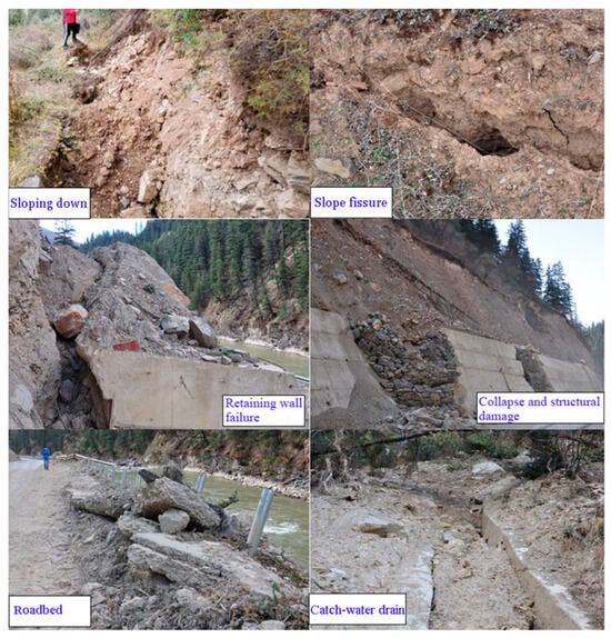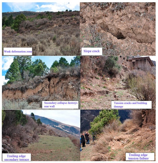 The strong deformation zone is in the middle and lower parts of the disaster body. The shape in plane view is semi-elliptical, and the elevation is stepped. The distribution elevation of the slope is 3080 m–3175 m, the width is approximately 210 m and the longitudinal length is approximately 260 m. The slope of the landslide is gentle and steep, showing a step-cliff shape. The gently sloped area is 15°–25°, and the slope of the lower free surface is nearly vertical, with an average slope of 41°. The strata in this area are mainly a Quaternary colluvial layer (Q4col+dl) and a Quaternary ice-water accumulation layer (Qfgl). The boundary of the strong deformation area is a circular crack, the back wall is bright, and the crack is filled with gravel soil and plant roots. There are also seven secondary cracks in the strong deformation zone, with multiple levels of scraping, obvious local dislocation cracking, loose and broken rock and soil mass, which are easily aggravated by rainfall or earthquakes. The shear outlet of the front edge of the strong deformation zone is the G227 National Highway and the Duke River. The high and steep excavation slope inside the highway has collapsed under the action of valley incision and air unloading, which is manifested by the outward deformation of the highway retaining wall, the bulging deformation of the steel gabion, the bulging soil crack and the local collapse deformation, as shown in Figure 5.