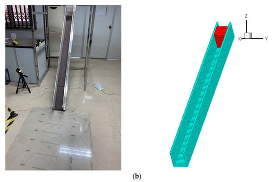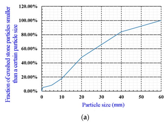 To obtain the landslide calculation parameters and the conventional physical and mechanical parameters required for numerical calculation, the landslide body and soil samples in the sliding zone were collected to carry out indoor testing. Draw the particle size distribution curve of the landslide used in the experiment through screening experiments. The results of the screening experiment are shown in the grading curve in Figure 7a. The flume experiment was built indoors to simulate the landslide movement, and the process of landslide movement was recorded by motion-capture camera equipment. Then, a 1:1 numerical flume model was constructed to restore the movement process of the landslide materials to calibrate the calculation parameters. The physical and numerical models of the flume test are shown in Figure 7b.