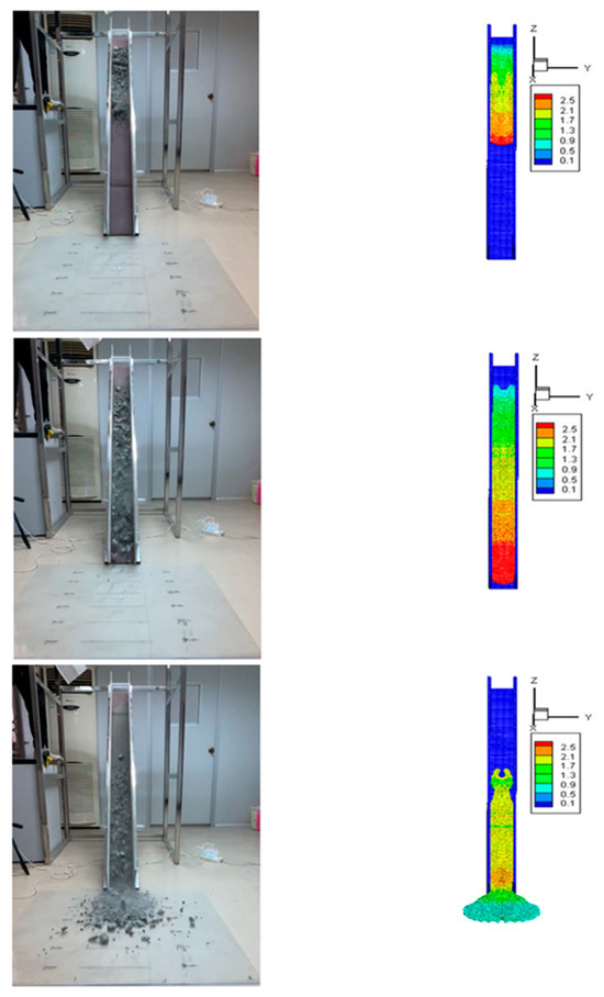 The SPH numerical simulation results are compared with the results of the actual indoor flume physical model experiment. The flow material is treated as dry granular in simulation to be consistent with the experiment. As shown in Figure 8, the results of the flume physical model and the SPH numerical simulation at 500 ms, 900 ms and 1400 ms are selected. In the simulation, different friction angles of landslide material and friction coefficient of solid boundary are evaluated to simulate the channel experiments until the simulation results agree well with the experimental results. The results show that when the internal friction angle of the landslide material is set to be 30°, the friction coefficient between the sandpaper and the landslide is 0.4 and the friction coefficient between the landslide and the acrylic plate is 0.3; the calculated simulation results are better reproduced and agree well with the experiment results.