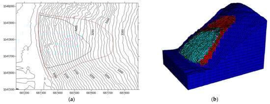 The topographic map and the stability analysis calculation model of the landslide. (a) Topographic map of the landslide area; (b) the numerical model of the stability analysis.