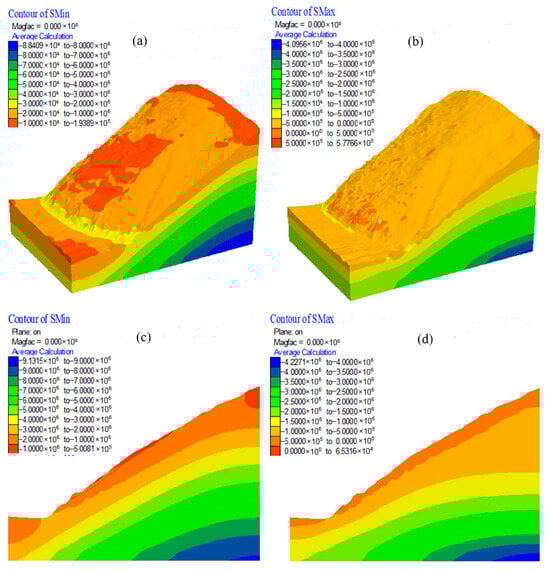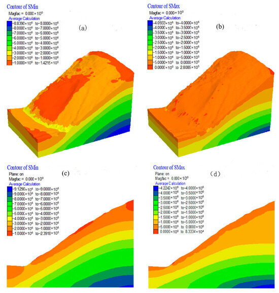 Characteristics of the landslide stress field in the strong deformation zone under ordinary rainfall conditions. (a) Maximum principal stress; (b) Minimum principal stressss; (c) Maximum principal stress of section; (d) Minimum principal stress of section.