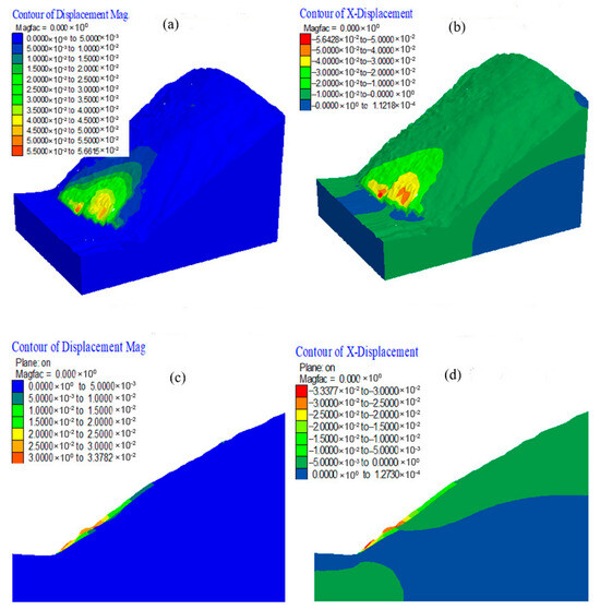 To analyze the deformation and failure characteristics of the landslide, the displacement is analyzed, and the displacement cloud diagram is shown in Figure 12.