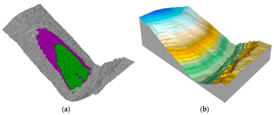 To obtain high-precision data of the terrain of the field area, a UAV is used to image the field area, and then a high-precision topographic map is constructed, as shown in Figure 10a. The landslide stability calculation model is constructed according to the topographic map, as shown in Figure 10b. The deformation and failure mode of the slope under the action of gravity is analyzed. Horizontal tectonic stress is not applied in the model, and the side-edge boundary and the bottom boundary of the model are in the form of a one-way constraint.