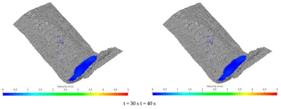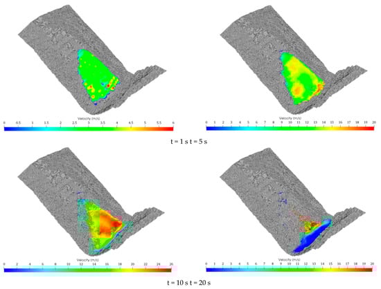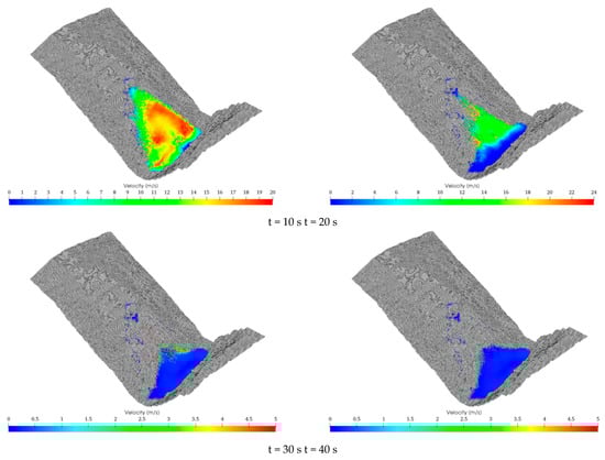 Under the high-intensity rainfall condition, the landslide occurred two times, both before and after sliding, and the velocity evolution process of the front and rear sliding of the landslide is shown in Figure 19 and Figure 20. According to the calculation results of Figure 19, it can be seen that the strong deformation zone in front of the landslide starts to slip first, the maximum movement speed after sliding initiates can exceed 25 m/s and it quickly accumulates in the river after 20 s. The slope collapses and blocks the river, and the volume of accumulation in the river exceeds 550,000 m3.