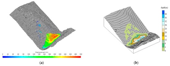 The simulation results of the second landslide in high-intensity rainfall condition. (a) Displacement after all sliding (before and after landslide); (b) accumulation depth after all sliding.
