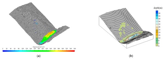 The simulation results of the first landslide in high-intensity rainfall condition. (a) Displacement after sliding (front strong deformation zone); (b) accumulation depth after sliding.