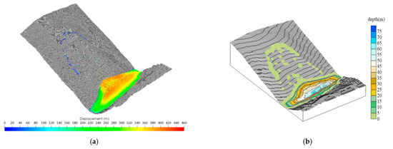 To intuitively evaluate the material migration formed by the two landslides, the displacement distribution and accumulation depth of the landslide under the final form of accumulation are shown in Figure 18.