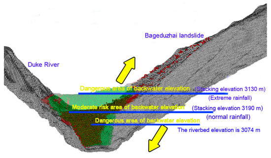 According to the calculation results, the accumulation thickness of the landslide in the river and the range of the backwater elevation are predicted, and the range of the height of river-blocking after landslide instability is shown in Figure 23, which can provide a reference for secondary disaster prediction.