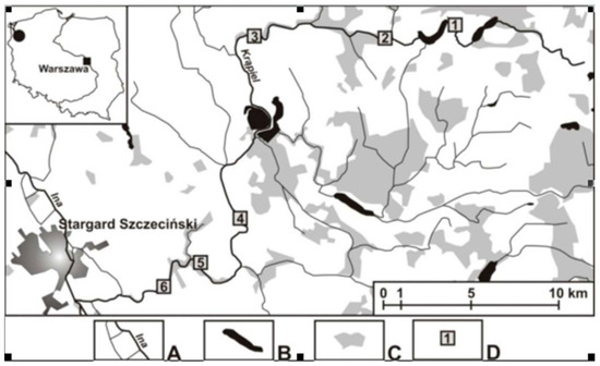 Six locations for assessments of the hydromorphological conditions of the river and for the collection of biological samples were established along the course of the river (Figure 1): site 1 (S1) (53°28′10.63″ N 15°21′41.79″ E), S2 (53°27′36.97″ N 15°16′33.2″ E), S3 (53°27′41.47″ N 15°12′22.94″ E), S4 (53°21′6.4″ N 15°11′5.23″ E), S5 (53°20′29.56″ N 15°9′15.04″ E), and S6 (53°19′58.14″ N 15°7′57.54″ E).
