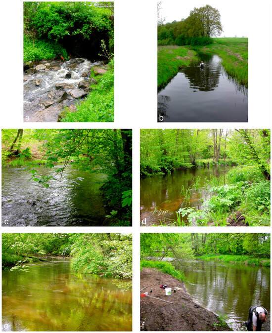 Each sampling site was selected as representative of a certain state of habitat degradation and/or modification. Site 1 can be described as 80% natural. The modification of this site involved the placement of large stones in the river bed just beyond the culvert. This resulted in a change in flow from laminar to turbulent and gave the habitats a pseudo-mountainous character (Figure 2a). At site 2, the river had undergone severe anthropogenic alterations and took the form of a straight, deepened channel (Figure 2b). Site 3 is located on a natural stretch of the river, which flows through an alder carr. In some places, it is like a mountain river, with some parts having a laminar flow and others with a turbulent flow (Figure 2c). Site 4 was anthropogenically modified, but long ago, and it is currently in an advanced restoration process (Figure 2d). Site 5 (Figure 2e) is located on a natural stretch of the river. There are anthropogenic modifications at site 6: regulation of part of the channel located near the road and the presence of a bridge that raises the water level (Figure 2f).