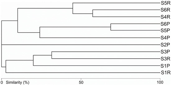 Grouping of Hydrachnidia communities present in riffles and pools at individual sites. S1–S6—study sites; R—riffle habitats; P—pool habitats.