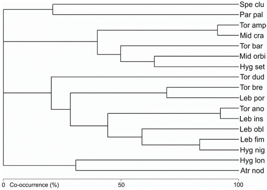 Co-occurrence of water mite species. Par pal—Parathyas palustris; Leb fim—Lebertia fimbriata; Leb ins—L. insignis; Leb obl—L. oblonga; Leb por—L. porosa; Spe clu—Sperchon clupeifer; Tor amp—Torrenticola amplexa; Tor ano—T. anomala; Tor bar—T. barsica; Tor bre—T. brevirostris; Tor dud—T. dudichi; Atr nod—Atractides nodipalpis; Hyg lon—Hygrobates longipalpis; Hyg nig—H. nigromaculatus; Hyg set—H. setosus; Mid cra—Mideopsis crassipes; Mid orb—M. orbicularis.