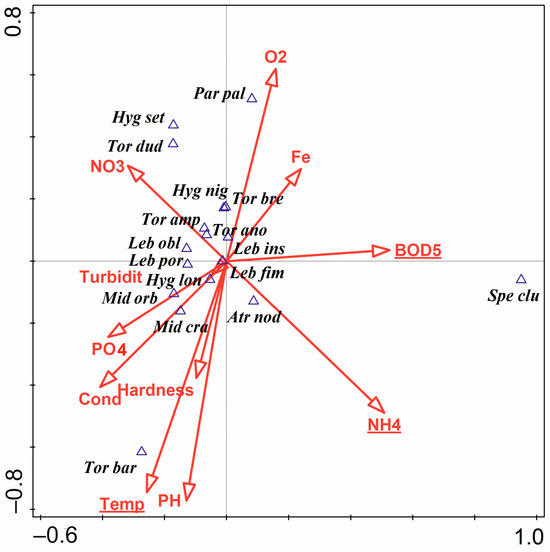 Figure 8 presents relationships between the distribution of water mite fauna and the physicochemical parameters of the water. Eleven variables used in the ordination explain 39.4% of the total water mite species variance. Three of them (BOD5, temperature, and NH4) were statistically significant (p = 0.005, p = 0.014, p = 0.034, respectively) and explained 18.0% of the total variance in the occurrence of species (BOD5 6.2%, temperature 6.0%, and NH4 5.8%).