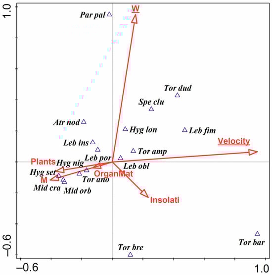 CCA of water mite distribution in relation to selected environmental parameters (marked in red). Velocity—water flow, Insolati—insolation, Plants—density of aquatic vegetation, OrganMat—proportion of organic sediment, M—mean sediment grain size, W—sediment sorting. Underlined parameters are statistically significant. Species name abbreviations as for Figure 6.