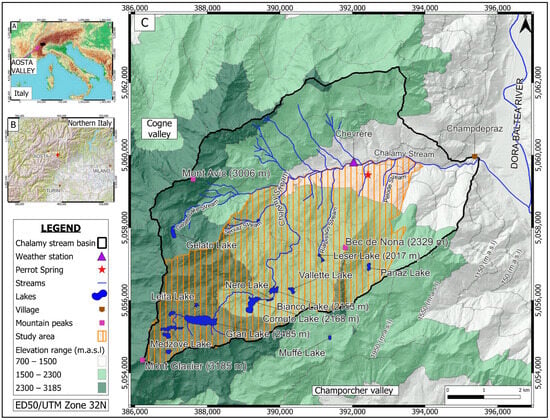 The Perrot Spring, studied in this research, is located in the central-eastern part of the Aosta Valley, in the municipality of Champdepraz. More specifically, the spring is in the Chalamy Valley at an altitude of 1300 m above sea level (a.s.l.), on the right orographic slope (Figure 1). Altimetrically, the investigated area is located between 3185 m a.s.l. of Mont Glacier and 850 m a.s.l. of the Chalamy Valley floor, that covers a surface of approximately 28 km2.